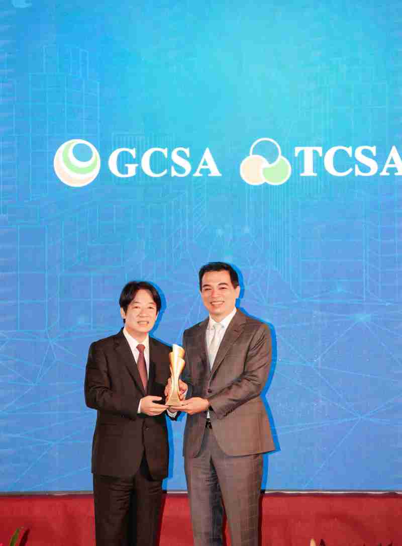 达全方位永续表现获全球永续奖及台湾永续奖肯定,,由副总统赖清德颁奖 (左),,尊龙集团总经理柯富仁 (右) 代表领奖