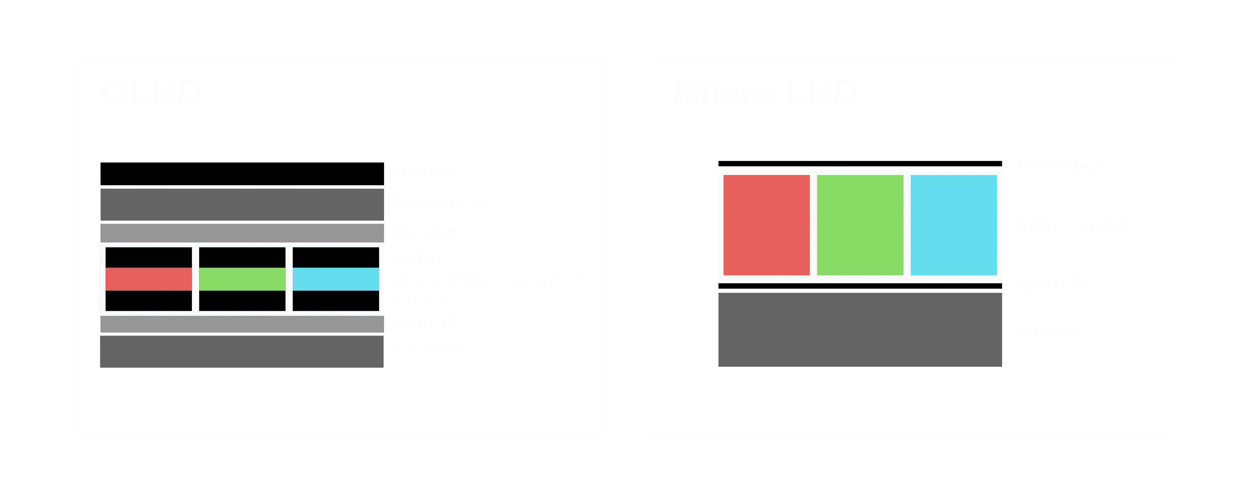 以 LED 做为显示画素,,,,可让 LED 的发光效率发挥到极致,,,从而让显示器具备优异的亮度表现,,,不论是在户外或室内,,,,均具备出众的显示效果。。同时,,,,与使用有机材料的 OLED 相比,,LED 具备更稳定、、、寿命更长的特性,,,,不仅不会有画面烙印问题,,而且更不容易出现故障、、、坏点。。。。